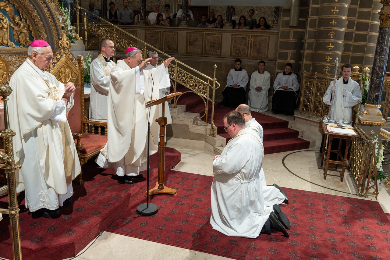 A püspök fölszentelő kézrátételét követte a jelen lévő papok kézrátétele a jelöltek fejére annak jeleként, hogy az idősebb testvérek befogadták az új papokat az egyházmegye papi közösségébe.
