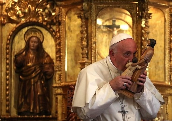Ferenc pápa megcsókolja Szent József kegyszobrát (Lima, 2018. január 21.)