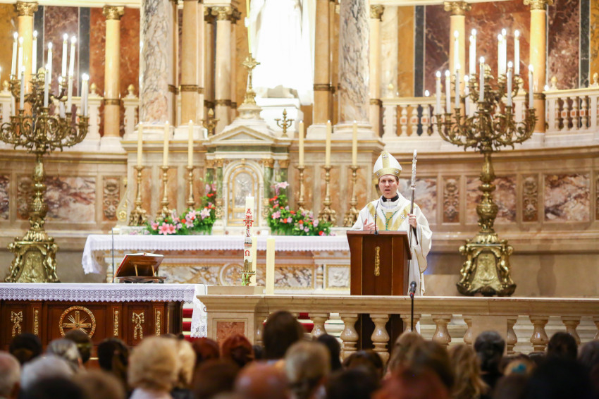 Az esztergom-budapesti segédpüspök prédikációja elején leszögezte, miközben a szentekre tekintünk, őket tiszteljük, nem szabad megfeledkeznünk arról sem, hogy ők ugyanolyan emberek voltak, mint bármelyikünk. Ugyanúgy erre a világra születtek. Nem azért váltak szentté, mert bármilyen különleges adottsággal rendelkeztek volna már a kezdettől fogva. Egyikük sem volt az életszentségre predesztinálva. Egyszerűen csak ők, a szentek azok, akik életük során az Istentől – egyébként mindenki felé kiáradó – kegyelmet felismerve és elfogadva, vele együttműködve kibontakoztatták magukban a lehetőségeket és Isten mindannyiunknak szánt ajándékait. Ha valaki ezt megteszi, abból nagyon sok áldás, lelki gazdagság és hatalmas örökség származik. Ezt Szent István királyunk és a hitvalló Mindszenty bíboros példája is szépen illusztrálja. De akkor is igaz: a szentek is emberek. Még ha bűntelenek is, nem hibátlanok. Nem tökéletesek. Hiszen az az Isten.