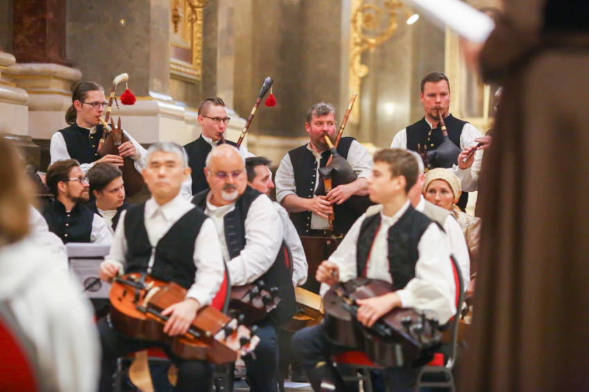 A misén közreműködtek a Magyar Tekerőzenekar, a Virtus dudazenekar és barátaik, a Ward Mária Zeneművészeti Szakgimnázium, a Zeneakadémia, a Szent Angéla Ferences Gimnázium, az Óbudai Népzenei Iskola egyházi és népi énekesei és barátaik, valamint további népi hangszeresek furulyán és hegedűn; orgonán pedig szintén a Ward Gimnázium egyházzenésze, Faragó Ákos kísérte az énekeket.