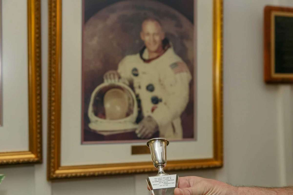 Az első holdbéli úrvacsorát ezért nem közvetítették. Az eseményre egyébként még azelőtt sor került, hogy emberi láb lépett volna a Föld kísérőbolygójára. Történt ugyanis, hogy 1969. július 20-án Neil Armstrongnak és Edwin „Buzz” Aldrinnak az Apollo 11 holdkompjának landolása után várakoznia kellett egy óráig a kiszállás előtt regenerációs és felkészülési céllal. Aldrin presbiter volt a houstoni Webster presbiteriánus gyülekezetben, és előzetesen különleges engedélyt kapott, hogy élhessen úrvacsorával az űrben. A közösséget egyébként az „asztronauták gyülekezetének” is nevezik (a tagok jelentős része tudós vagy mérnök, és ez összefér a hitükkel), ahol egyébként évente megemlékeznek a Földtől 250 000 mérföldre történtekről. Mielőtt a holdraszállók kiléptek volna a Nyugalom tengerének nevezett holdi területre, Aldrin először a földi személyzethez szólt, néhány pillanatnyi csendet kérve mindenkitől, azt is javasolva, hogy mindenki a saját módján adjon hálát a történtekért. Ezután kitöltötte a bort a kehelybe, azt és a kenyeret magához vette, illetve olvasott a Szentírásból: