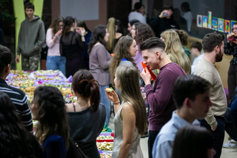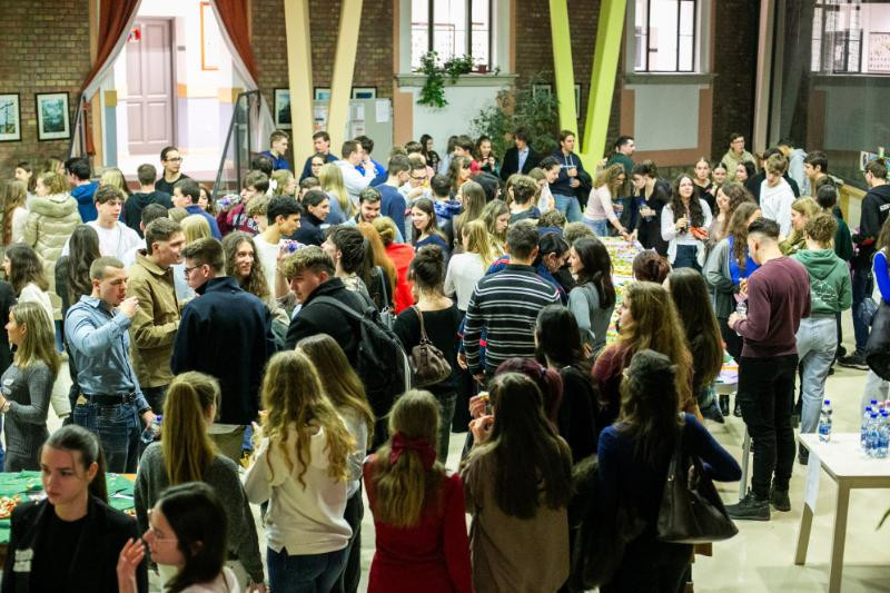 Az intézmény díszterme teljesen megtelt az érdeklődő fiatalokkal, akik a közös tájékoztatót követően kötetlen állófogadás keretében beszélgethettek az öregdiákokkal.