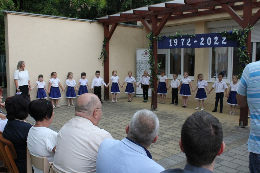 Az óvoda udvarán kezdődő ünnepség az eleredő eső miatt az egyik csoportszobában folytatódott. Ez azonban nem akadályozta meg a gyermekeket és óvónőket, hogy színes, vidám magyar és német nyelvű műsorukkal méltó módon ünnepeljék meg az intézmény 50 éves fennállását.
