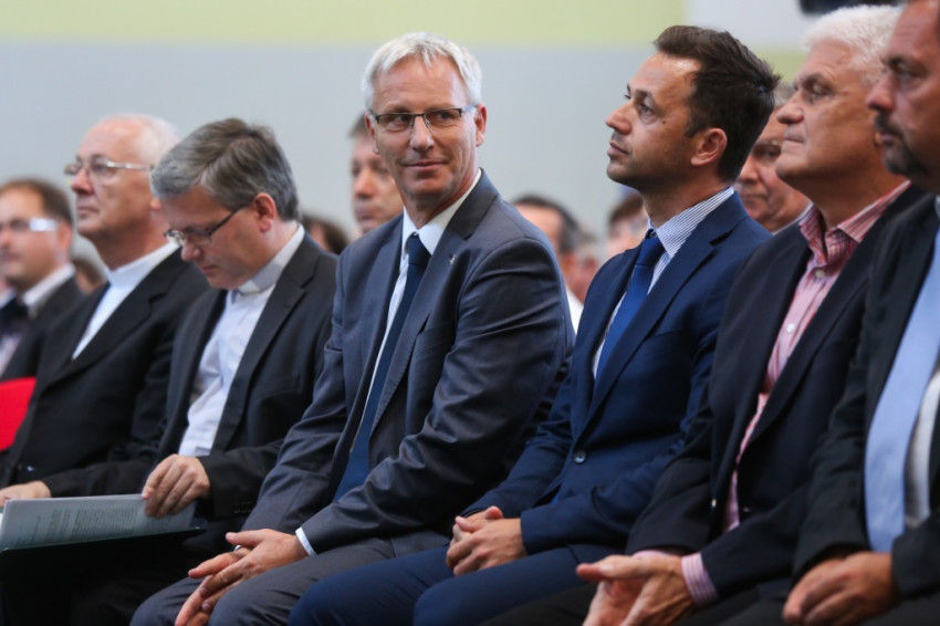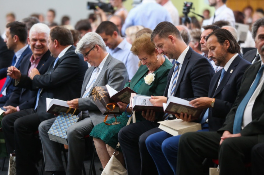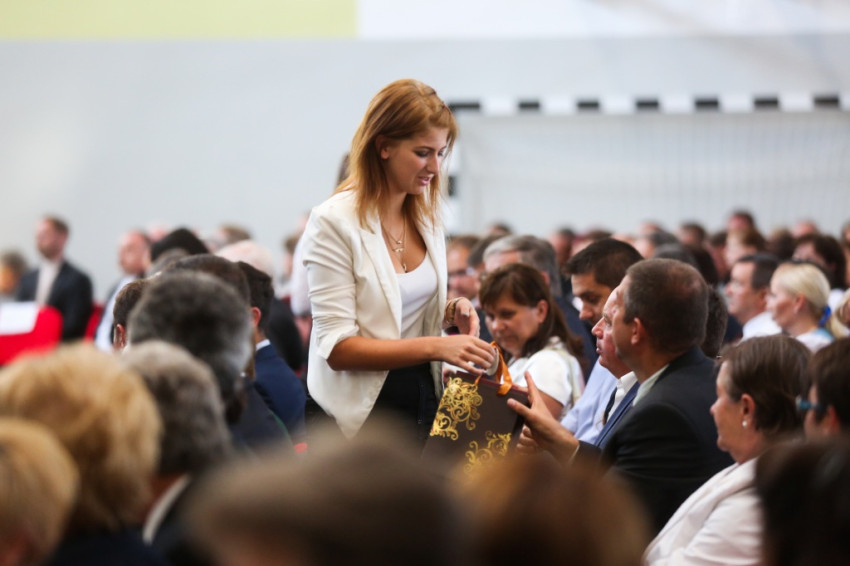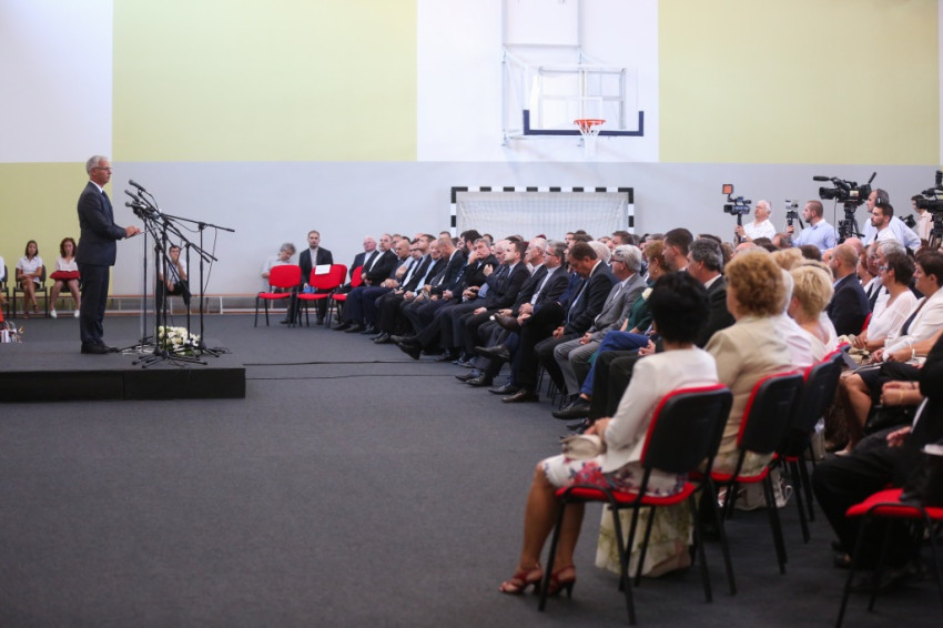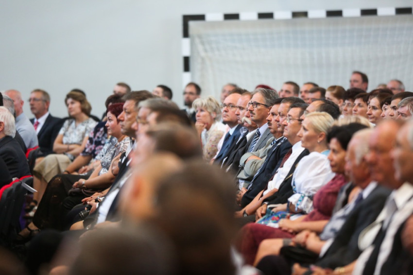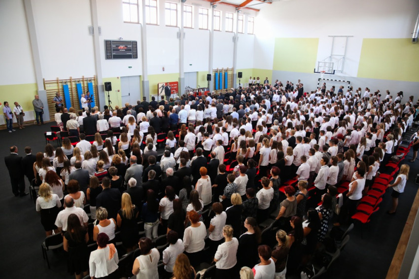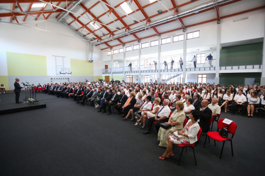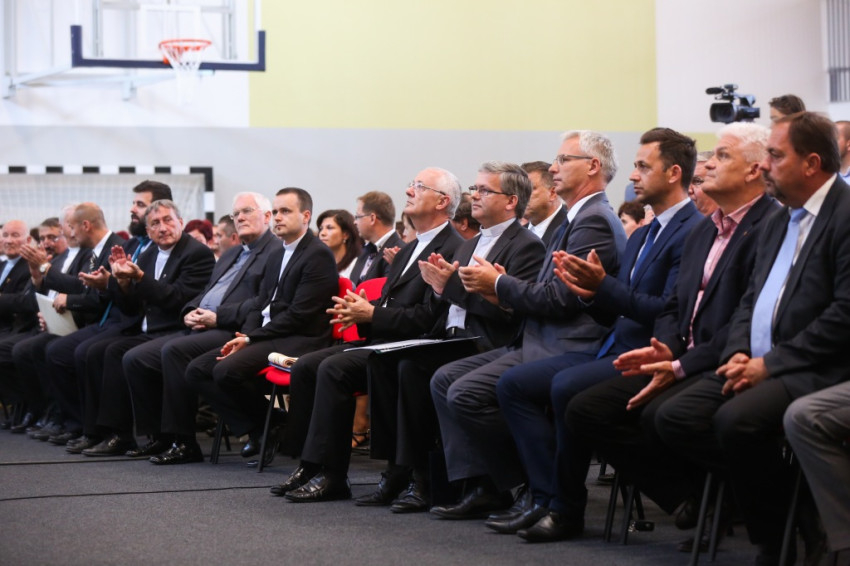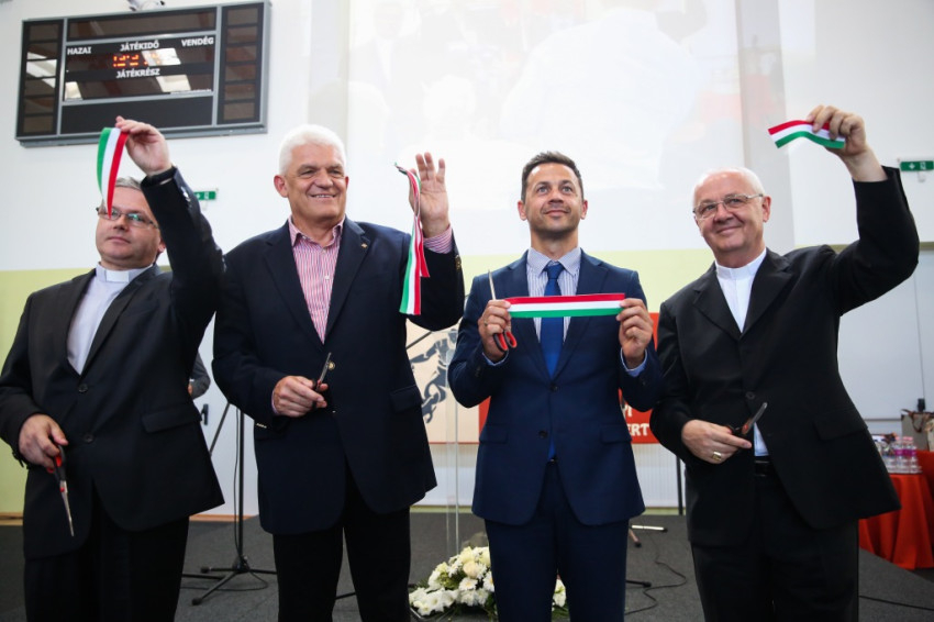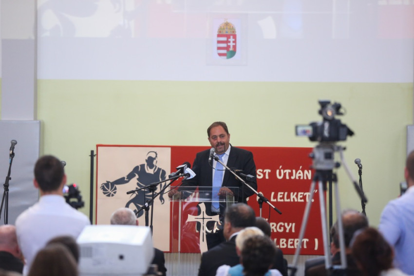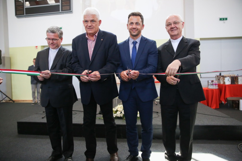 A nap következő, leghosszabbra nyúlt programpontja az általános iskola új kosárlabdacsarnokának átadása volt. Soltész Miklós egyházi, nemzetiségi és civil társadalmi kapcsolatokért felelős államtitkár, Kozmann György sportért felelős helyettes államtitkár, Pócs János parlamenti képviselő, Szabó Tamás, Jászberény polgármestere, Szalay Ferenc, Szolnok polgármestere és a Magyar Kosárlabdázók Szövetségének elnöke, Dobos Róbert, a járási hivatal elnöke, a főigazgató-plébános és Vechta, Jászberény testvérvárosának küldötte is beszédet mondott az átadón. A plébános felidézte az elmúlt évek legfontosabb iskolafejlesztési lépéseit, és köszönetet mondott a helyi vállalkozóknak meg a főegyházmegyének, hogy segítettek a megújulásban.