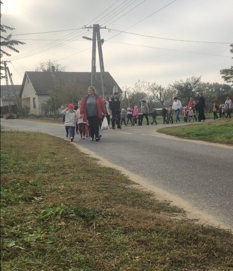 A temető kapujában idén is Ignácz András parókus, az óvoda lelki igazgatója és Rádi Dávid segédlelkész várta a közel száz gyermekből álló zarándokcsoportot és az őket kísérő pedagógusokat.