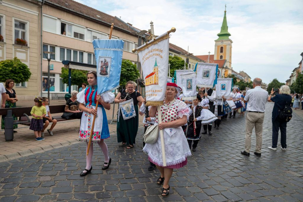 A gyönyörű népviseletbe öltözött búcsújáró menet vasárnap kora délelőtt a Szentháromság-főplébániatemplomtól indult el az ünnepi mise helyszínére, a Palóc liget szabadtéri színpadához.