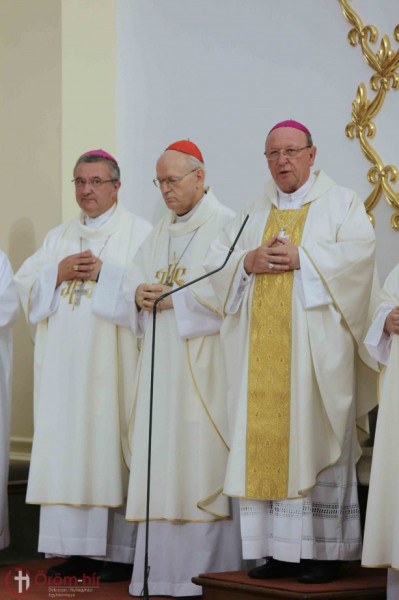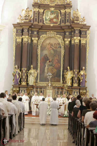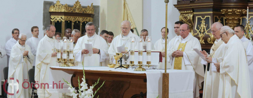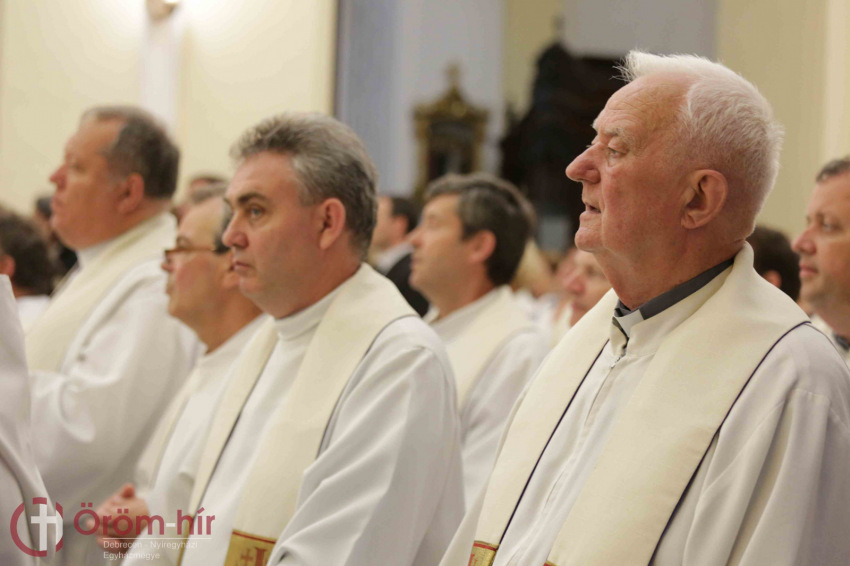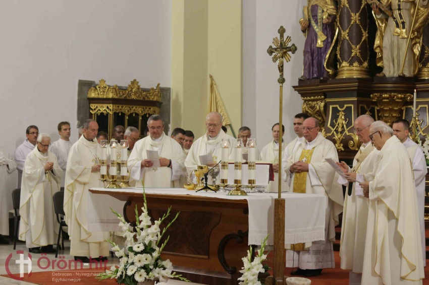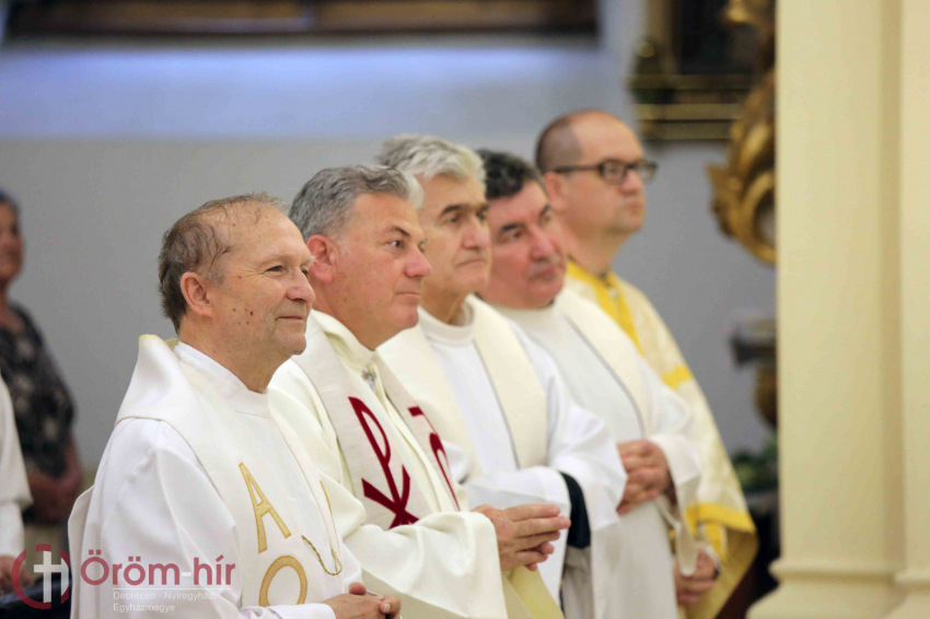 A szentmise szónokaként Bosák Nándor nyugalmazott debrecen-nyíregyházi püspök kifejtette: az ember életében sok olyan alkalom van, amikor emlékezik a múltra, a jövőre tekint, és értékel. Ezért minden jeles évforduló hálaadás és egyben kegyelemgyűjtés az előttünk álló feladathoz. Papi jubileumon a papság gondolata áll mindannyiunk előtt, amely szolgálat mindig a közösségért szól. A II. vatikáni zsinat a liturgiáról és az Egyház szentségi feladatáról megfogalmazza, hogy a liturgia csúcsa és forrása Jézus Krisztus, aki az Egyházon keresztül eljut minden emberhez: így a papi szolgálat forrását és csúcsát is jelenti. Így valósul meg az, hogy a papság csúcsa Krisztus, mivel a krisztusi szeretet, mű eszközévé válik, amelyet akkor tud megvalósítani, ha teljesen átadja magát e szolgálatnak. Nem könnyű feladat. Éppen ezért, amikor a pap a múltra gondol, azért ad hálát, hogy kimondta: életét belehelyezi Isten tenyerébe, hogy szétossza Őt, vagyis részt vegyen az üdvösségben, amit Krisztus a világnak szánt. Amikor azt mondjuk, Krisztus a csúcs, az mindig irányulást jelent: az utat, melyen a pap halad, nem pedig a cél elérését. Mert bármennyi év telt is el az elindulástól, mindig úgy érzi, hogy lemarad, hogy kevés, amire jutott. Ez így természetes, a baj az lenne, ha életünk bármelyik szakaszán azt mondanánk, hogy már elértük, megtettük a magunk feladatát – hangsúlyozta a szónok.