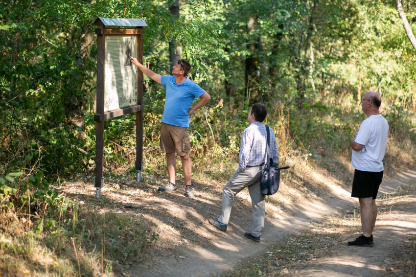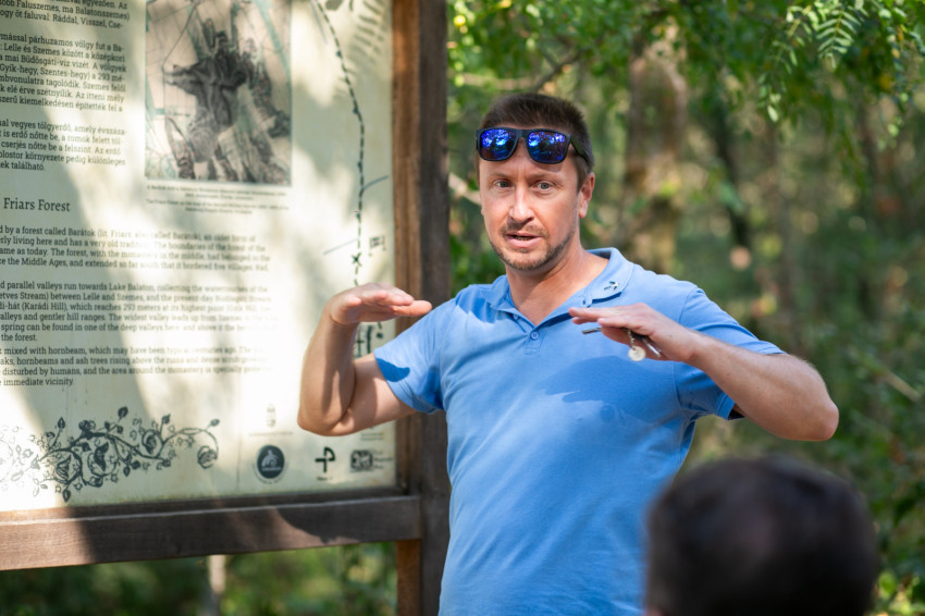 S mindezek megkoronázásaként a nagy közös ügyekért elkötelezett vendéglátónk régóta szeretne egy kilátót a Balatonszemes fölötti, közel háromszáz méter magas Mészkemence-tető északi letörésén. Ennek érdekében folyamatosan egyeztet az erdészettel, a nemzeti park munkatársaival. A pálos kolostorromtól vadregényes vízmosáson át közelíthető meg a csúcs, ahonnan száznyolcvan fokos panoráma nyílik szó szerint az egész Balatonra. Megnéztük. Igaza van, valóban páratlan a kilátás. Bátran állítható, a Barátok erdeje e téren is egyedülálló.