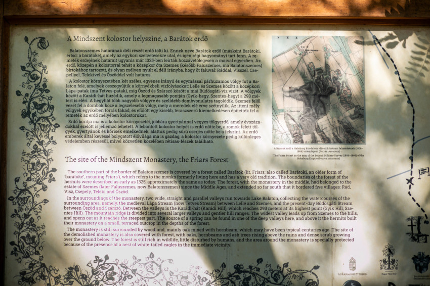 Balatonszemes központjától nagyjából négy kilométerre, a domboldalban helyezkedik el a Barátok erdeje övezte, fakereszttel jelölt ligetes terület, az egykori kolostor alapjait magában foglaló pálos emlékhely. A település szélétől pedig mindössze két kilométer az út az enyhén emelkedő, gondosan kitáblázott, rendi vonatkozású idézetekkel megállásokra, elmélkedésekre késztető Pálos emlékhely tanösvényen. Különös kitétel, hogy a terület július 1. és december 31. között látogatható. A miértre Mórocz Viktor adja meg a választ: az egyik fa magasában az év első felében kiemelten védett rétisasok fészkelnek.