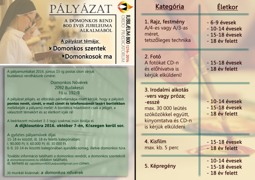 A különféle korcsoportok számára kiírt pályázatra Domonkos szentek, illetve Domonkosok ma témában lehet pályamunkákat benyújtani 2016. június 15-ig.