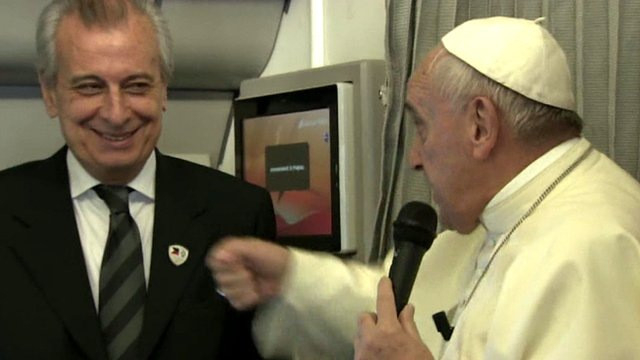 Ferenc pápa: Köszönöm az okos kérdést! Úgy gondolom, hogy mindkettő alapvető emberi jog: a vallásszabadság és a szólásszabadság. Nem lehet…, gondoljunk csak…. Ön francia, menjünk Párizsba! Beszéljünk világosan! Nem lehet elrejteni azt az igazságot, hogy mindenkinek joga van a saját vallását szabadon gyakorolni, anélkül hogy megsértene bárki mást. Így tesszük, így szeretnénk tenni mindnyájan! Másodszor, nem sérthetünk meg másokat, nem kezdhetünk háborút, nem ölhetünk a saját vallásunk, vagyis Isten nevében! Ami most történik, az megdöbbent bennünket. De állandóan gondoljunk a történelmünkre: mennyi vallásháborúban volt részünk? Gondoljon csak ön a Szent Bertalan éjszakájára! Hogyan értsük ezt? Ez egy eltévelyedés! Isten nevében ölni – ez eltévelyedés! Azt hiszem, hogy ez a legfontosabb dolog a vallásszabadság tekintetében: szabadsággal kell eljárni, bárki megsértése nélkül, kényszerítés és gyilkolás nélkül.