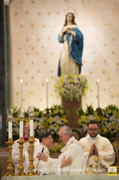 Ferenc pápa homíliája befejező részében a hit teremtőképességéről szólt. Ennek jegyében született meg a Fülöp-szigeteken az Istenben való mélységes hit, valamint a Szűzanya iránti buzgó tisztelet, és a meleg szívbéli ragaszkodás a rózsafüzér-imádsághoz. Ennek a nagy örökségnek erős misszionárius jellege van. Azért áldalak meg benneteket, hogy Krisztus kiengesztelő szeretete mindjobban hassa át a Fülöp-szigeteki társadalmat, és rajtatok keresztül a világ legtávolabbi részeit is.