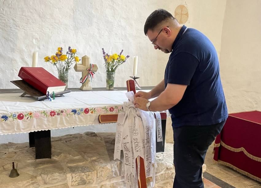 Életünkben folyamatosan úton vagyunk, felgyorsult világunkban szüntelenül rohanunk valahová – hangsúlyozta szentbeszédében Dallos Tamás komlói plébános, akinek a neve szintén felkerült a zarándokkereszt egyik szalagjára –, ugyanakkor sehol sem vagyunk ott igazán. Ma zarándokúton vagyunk, ami lényegileg más, mint a mindennapok céltalan rohanása, mert pontos értelme van. Ezen a földön nincs maradandó hazánk: eljövendő hazánk után vágyakozunk (vö. Zsid 13,14). Az Ószövetségben láthatjuk, például az egyiptomi kivonulás történetében, hogy Isten és ember kapcsolata gyakran a hosszú közös úton, közös vándorlás folyamán alakul ki, és lép bensőségesebb szintre. Isten együtt járja népével a vándorutat, vele van és megoltalmazza, célt és irányt ad haladásának. Saját életünkben ugyanezt a feszültséget, keresést, várakozást hordozzuk. Várjuk Isten útmutatását az állandó haza felé vivő úton. Jézus pedig azt mondja, azért megy vissza az Atyához, hogy helyet készítsen számunkra (vö. Jn 14,2).