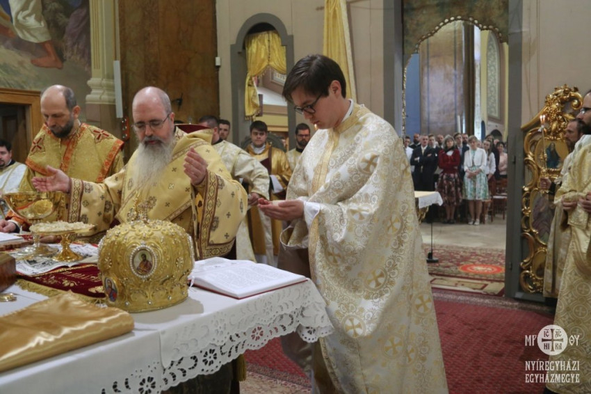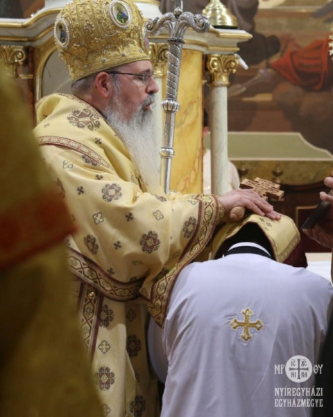 A görög főpásztor személyesen a szentelendőhöz intézte prédikációját. Beszédében a Szent Liturgia olvasmányait emelte ki. Elsőként Az apostolok cselekedeteiből vett olvasmányra utalt, mely leírja a hét diakónus, a közösséget szolgáló hét férfi kiválasztását, akik szolgálatukkal a testvéri szeretet munkatársaivá válnak a keresztény hívők között; ezt követően Márk evangéliumából idézte Arimateai József alakját, az előkelő Józsefét, akinek gondja volt Jézus testének eltemetésére, valamint emlékeztetett a kenethozó asszonyokra, akik vasárnap hajnalban siettek, hogy illatos szerekkel kenjék be Jézus testét.