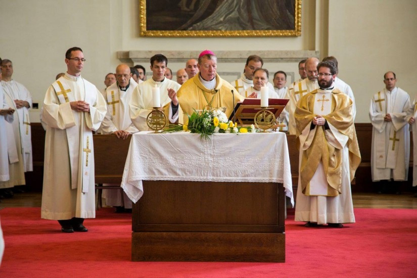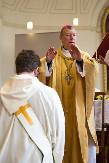 Beer Miklós régi kedves ismerősként köszöntötte Serényi Tamás piaristát, akit ő szentelt diakónussá 2015. november 5-én. Személyes hangvételű beszédet mondott, majd megkezdődött a szentelési szertartás.
