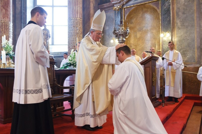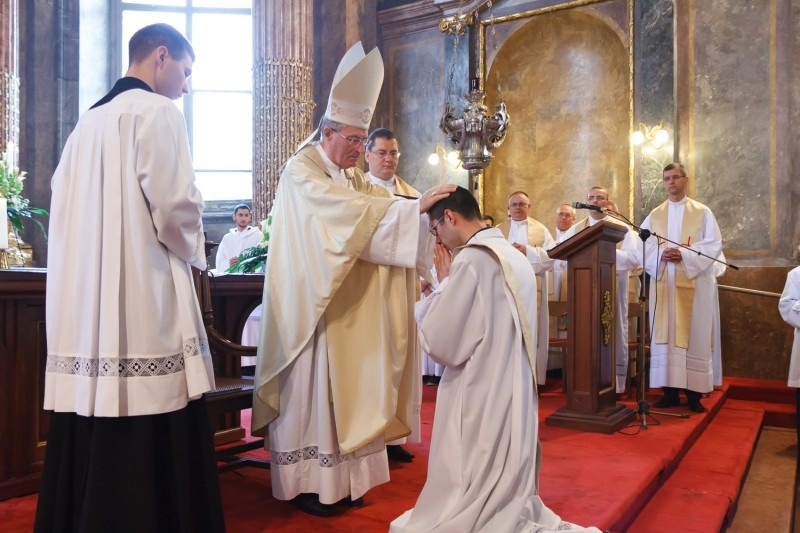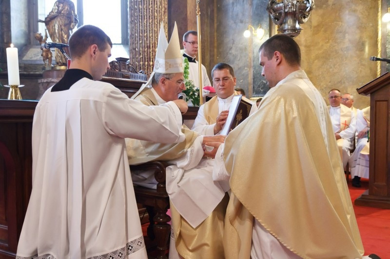 A homília után került sor a szentelési szertartásra, melynek lényeges mozzanata, amikor a főpásztor kézrátétellel a szentelés és az áldás gesztusa mellett a papi rend folytonosságát is kifejezi az új áldozópapok felé.