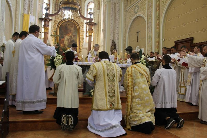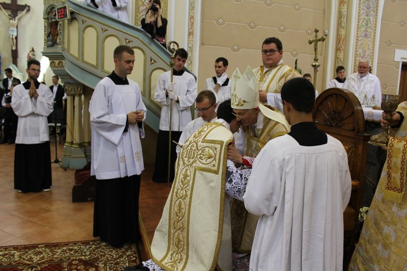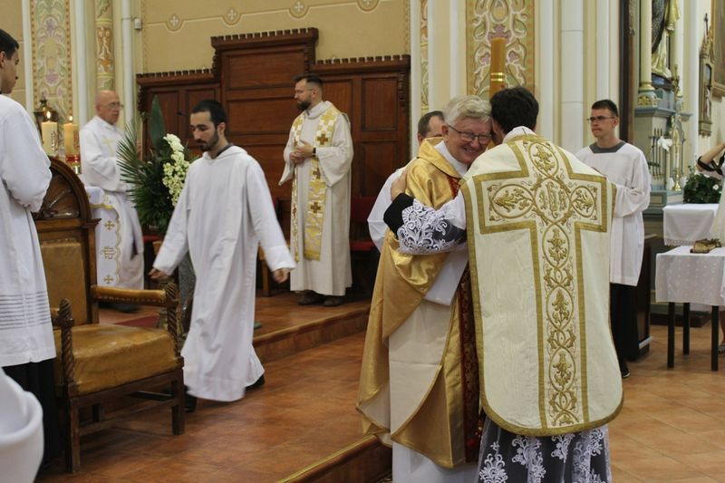 A Mindenszentek litániája elimádkozása után az új pap miseruhába öltöztetése, kezeinek olajjal való megkenése, a paténa és a kehely átadása következett. Majd előbb a püspökkel, utána a paptestvérekkel váltott békecsókot a felszentelt – e gesztussal örömmel fogadták maguk közé új társukat.