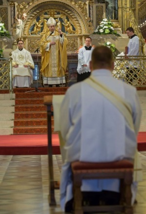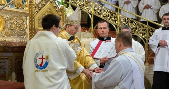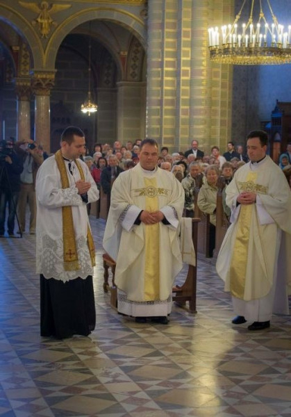 „Mindig különleges és kiemelkedő jelentőségű esemény a papszentelés egy egyházmegye életében – mondta Máger Róbert püspöki szertartó. – Az Úristen gondviselő szeretetét ismerjük föl benne, aki felszentelt szolgái által kíván gondoskodni népéről. A pap ugyanis Krisztusnak, a jó pásztornak a megjelenítője a rábízottak körében. Nehéz tapasztalat, hogy ma sokkal kevesebb papja van a Pécsi Egyházmegyének, mint a korábbi időkben. Egy papnak most jóval több települést kell lelkipásztorként ellátnia, mint régebben, ez sok energiát kíván. Ezért is vált szükségessé, hogy jól előkészített rendezési terv mentén összevonjunk plébániákat, s hogy a megyéspüspök ésszerűsítésekkel enyhítse papjai terheit. Az új papi hivatásokért való imádság állandó feladata az egyháznak minden időben. A hivatás ugyanis az Isten ajándéka, nem pusztán emberi elhatározás. Ugyanakkor az emberi tényezőt, a hivatás felismerését a fiatalok lelki nevelésével folyamatosan erősíteni kell, hogy meghallja az ember, ha az Isten valami másra hívja, mint a mai világ: a neki történő elköteleződésre és az emberek szolgálatára.”