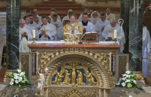„Menjetek az egész világra, hirdessétek az evangéliumot minden népnek! Menjetek – a feltámadottól hangzik el a küldő szó” – mondta Udvardy György pécsi megyéspüspök homíliájában. Jézus, aki mindvégig megtette az Atya akaratát, megismerteti az emberekkel, hogy mennyire szeret minket az Isten. Ennek az életnek értéke van. Mindent átad a tanítványoknak, és küldi őket. Ha Jézusra figyelünk, akkor életünk teljessé válik, és tudjuk küldetésünket teljesíteni – hangsúlyozta a főpásztor, majd XVI. Benedek pápa mondására hívta fel a figyelmet: „Keresztény létünk kezdetét nem egy ideológiai döntés, nem egy erkölcsi megfontolás jelenti, hanem a találkozás a feltámadott Krisztussal.”