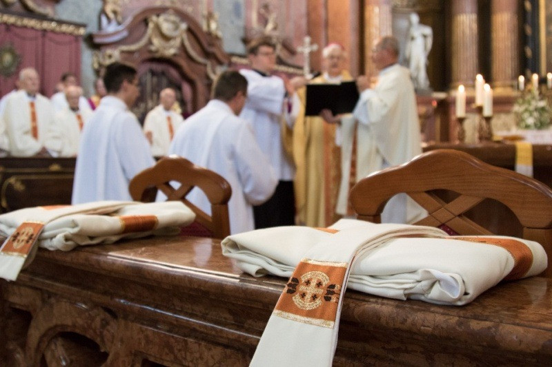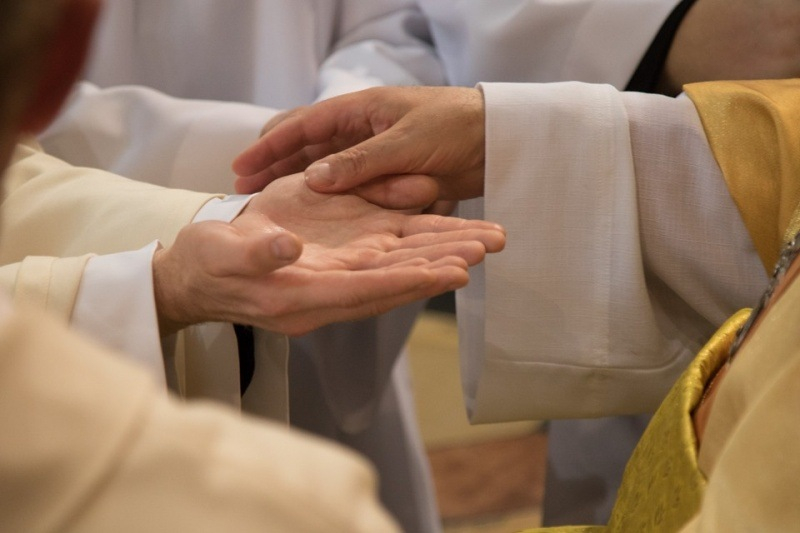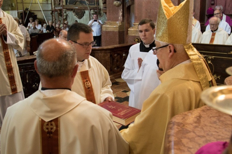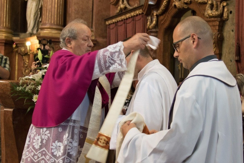 A homília után a püspök kezét a szentelendők fejére helyezte, majd elmondta a felszentelő imát. A felszenteltek megbízatást kaptak az áldozópapi, illetve a szerpapi szolgálatra, hogy a Szentlélek erejében élve dolgozzanak az egyházban, a világ üdvössége javára. A felszentelt új diakónusokat beöltöztették liturgikus ruháikba, megkapták szolgálatuk eszközét, az evangéliumoskönyvet. A papság áldása után a felszentelt új papra ráadták a stólát és a miseruhát, és a püspök megkente kezét krizmával. Átadta szolgálatának eszközeit, az ostyát a paténán és a borral megtöltött kelyhet.