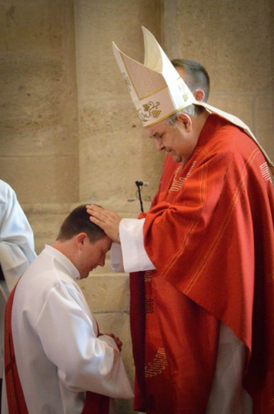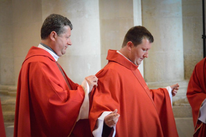 A papjelöltek egyenként a szentelő püspök elé térdeltek, aki kezét a szentelendők fejére téve csendben imádkozott, átadva nekik a papi hatalmat. Ezt követően a jelen lévő papok is sorban a felszenteltekhez járultak, és kezüket az ő fejükre téve kérték Isten áldását.