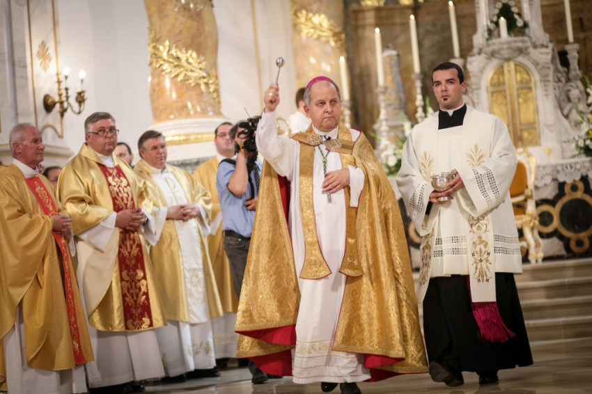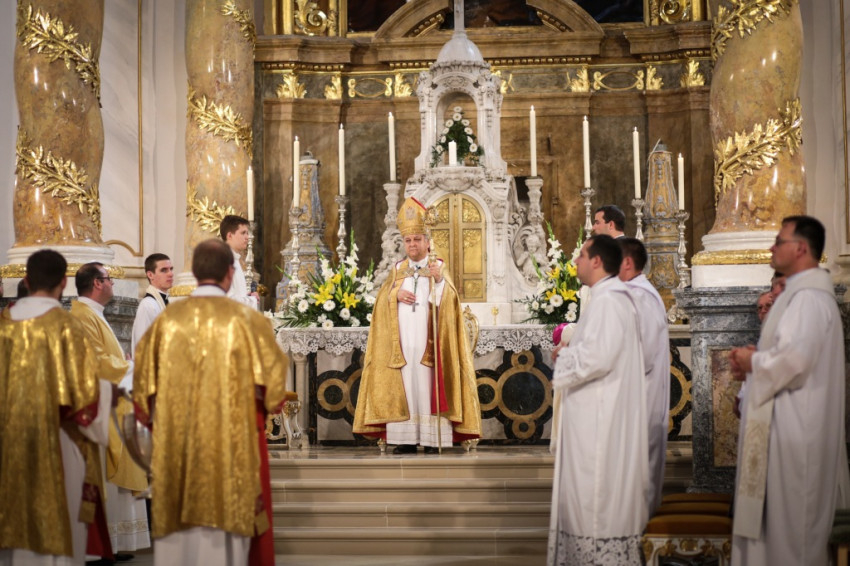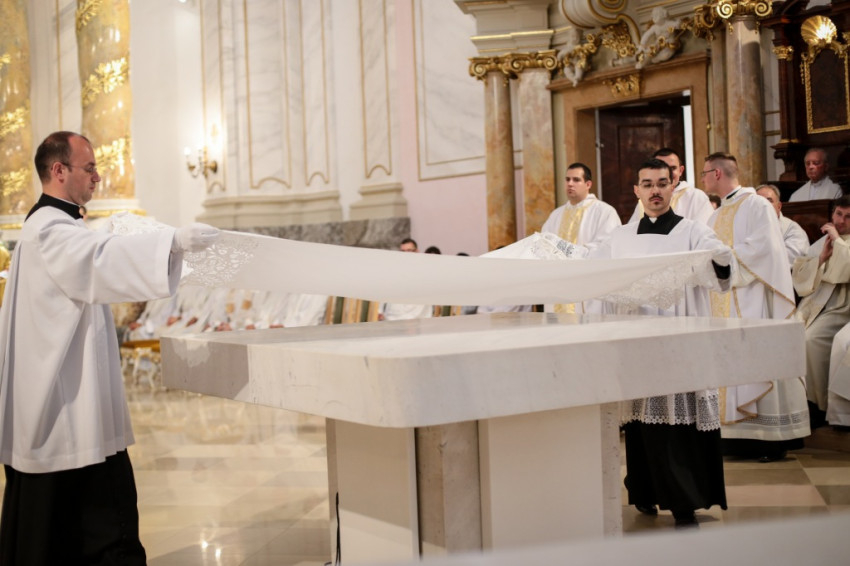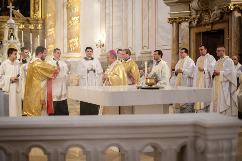 Bemegyek az Úrnak oltárához, mert ő nekem ujjongó örömem – az évszázadokon keresztül imádkozott lépcsőima antifónáját idézte Bábel Balázs érsek a papság bevonulását követően. Sok küzdelem után Isten szolgáltasson igazságot, örömöt a szívünkbe a templom megáldásának, az oltár felszentelésének és három pap szentelésének ünnepén – mondta a templomfelújítás éveinek nehézségeit megidézve az érsek.
