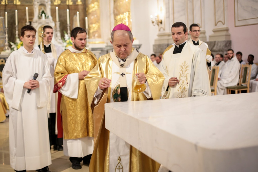 Számunkra a templomban jelen van Jézus az oltáriszentségben, az imádkozó hívek közösségében. Isten háza nem áll üresen, az Úr jelen van itt, behív imára, bűnbánatra, örömeink, kéréseink megfogalmazására. Életünk a kereszteléstől a gyászmiséig a templomhoz kötődik, különösen a papságé – fordult a szónok a szentelendőkhöz. „Itt mutatjuk be Krisztus áldozatát, amiben kiteljesedik a papságunk, és életünk áldozattá válik” – szólt.
