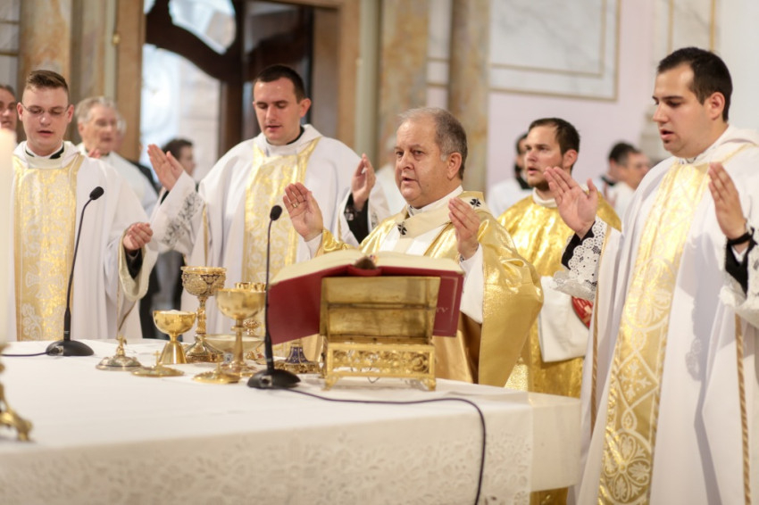 A szertartás az oltárszenteléssel, majd a szentmise liturgiájával folytatódott. Káptalani kinevezések zárták a szentmisét: Menyhárt Sándor, Szűcs Tibor, Kaló Krisztián kaptak esperesi rangot. Bábel Balázs köszöntötte az ezüst-, arany-, vasmisés paptestvéreket. Végül átadta az újmisések dispozícióit. Az ünnepi liturgiát a köszönetek sora zárta. Az érsek kiemelte Vörös Márta főépítész munkáját: „Pro Domo Dei” – ez az elkötelezettség jellemezte mindvégig munkáját – méltatta az építész tevékenységét.