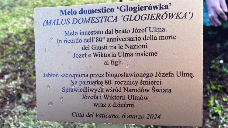 Parolin bíboros államtitkár is emlékműként beszélt az almafáról a szertartás elején mondott köszöntőjében. Részletesen felidézte az Ulma család történetét, akik „a végsőkig, egészen az életáldozatig megélt evangéliumi szeretet példái”. „Ma – jelentette ki a bíboros – azért vagyunk itt, hogy emlékezzünk és almafát ültessünk annak emlékére, ami 1944. március 24-én a nácik által megszállt lengyelországi Markowában történt a második világháború idején. Józef Ulma feleségével, Wiktoriával úgy döntött, hogy nyolc, általuk ismert családhoz tartozó zsidónak ad menedéket. Szomszédaik tanúsága szerint számukra természetes volt, hogy segítettek az üldözötteknek, és a zsidók befogadása megfontolt döntés volt. Sokszor mondták nekik: »Ne bújtassatok zsidókat, mert bajba kerültök.« Józef pedig határozottan válaszolt: »Ők emberek… Soha nem fogom elűzni őket.« Az Ulma családot feljelentették, házukhoz náci fegyveresek érkeztek. Mindannyiukat megölték: először a nyolc zsidót, majd Wiktoriát és a férjét, hogy a falubeliek lássák, milyen büntetés vár a zsidókat bújtatókra. A hat gyerek sikoltozni kezdett, de őket is meggyilkolták. Perceken belül tizenhét ember halt meg, köztük az Ulma házaspár hetedik gyermeke, aki még az anyaméhben volt a terhesség utolsó szakaszában. Még ennek a meg nem született gyermeknek is, akinek a nevét csak az ég tudja, a vértanúság pálmáját ítélték oda” – fogalmazott a vatikáni államtitkár.
