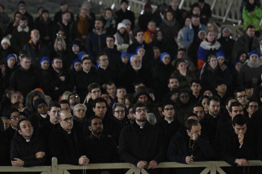 Meghitt légkör hatotta át az estét. Megközelítőleg harminc bíboros ült a bazilika előtti téren. Az első sorban feltűnt többek között Luis Antonio Tagle, Marc Ouellet, Robert Prevost, Ángel Fernández Artime SDB, Angelo Bagnasco, Enrico Feroci, Marcello Semeraro, Raymond Leo Burke, Gerhard Ludwig Müller és Baldo Reina. Mások, mint például Michael Czerny bíboros, a hívők között ültek. Jelen volt még Raffaella Petrini nővér, aki március 1-jétől a Vatikánvárosi Állam Kormányzóságának elnökeként dolgozik majd, valamint a Kúria és a római egyházmegye több munkatársa.
