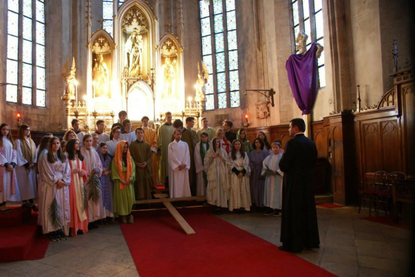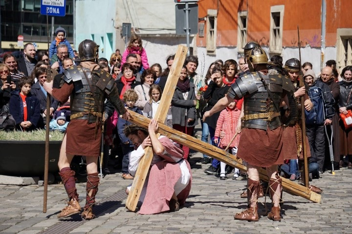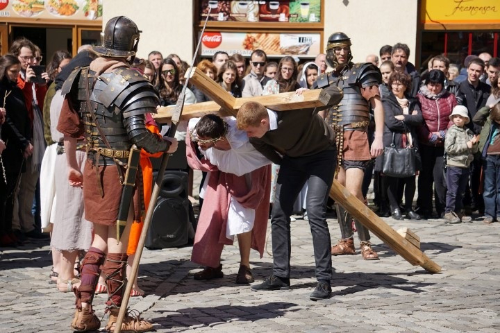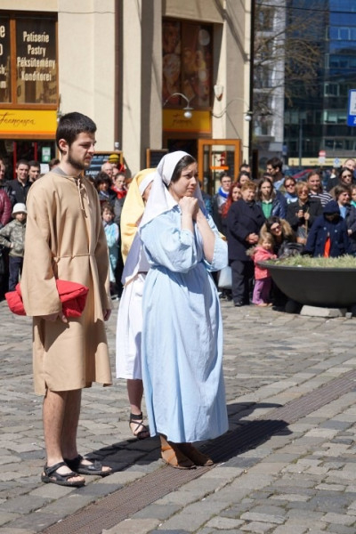 A városban a ferences ifjúsági csoport és az egyetemi lelkészség tagjai is tartottak szabadtéri passiót a Karolina téren.