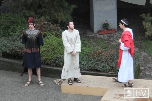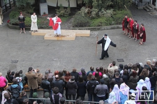 Marosvásárhelyen zsúfolásig megtelt virágvasárnap délután a Deus Providebit Tanulmányi Ház udvara, ahol középiskolások és egyetemisták adták elő a passiót.