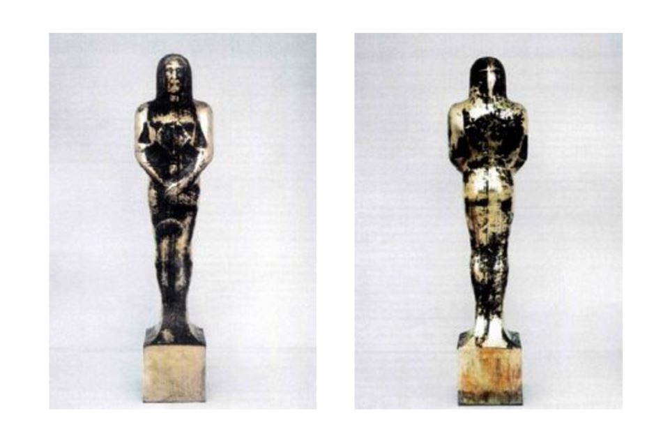 El kellett döntenie tehát az alkotónak, hogy fekvő vagy álló testet mintáz meg. Hónapokat vett igénybe az a folytonos töprengés és rágódás, amelynek eredményeként az álló alakot választotta. Ezzel együtt is hű akart maradni azonban a lepel nyomaihoz. Ezért az álló alaknak meghagyta a fekvéskor jellemző, különös lábtartását. Ennek végső leegyszerűsítésével egy keskeny, lefelé szűkölő, ék alakzatot nyert, amely kompozíciós szerepbe került: posztamensként mentesítette anatómiai funkciója alól az általa modellezett végtagot. A test felületének megfelelő egységeire pedig fotóeljárással rámaratta a lepel képét. Ez az úgynevezett „pozitív” képmást ábrázolja a testen, simán és fényesen hagyva a világos részeket, érdesen és sötéten az árnyékosakat.