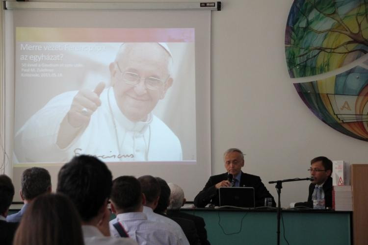 Paul M. Zulehner a könyvbemutatót követően Ferenc pápáról, illetve a vezetésével haladó egyház útjáról, irányultságáról beszélt „Merre vezeti Ferenc pápa az egyházat? 50 évvel a lelkipásztori konstitúció megjelenése után” címmel. Az emeritus professzor előadásában is bizonyította, hogy a tudományosság és tisztánlátás nem zárja ki a humort, az életközeliséget. A bécsi pasztorálteológus Ferenc pápa üzenetéről beszélt, s szavai azért is lehettek hitelesek, mivel személyes öröm és meggyőződés, egyház- és istenszeretet sugárzott azokból, amelyek fellelkesítették a hallgatóságot is. Ferenc pápa nemcsak a világ katolikusainak plébánosa próbál lenni, hanem az egész mai világé, s e mai világnak elsődlegesen gyógyítókra és gyógyításra van szüksége – hangsúlyozta az előadó. A pápa az egyházat s a mai világot hadikórháznak látja és láttatja: ilyenkor nem a vércukorszintet mérik a golyóval átlyuggatott sebesülteken, hanem előbb a halállal fenyegető sebesülést próbálják ellátni. A moralizálás nem teszi jobbá az embereket, a szeretet azonban igen – mutatott rá a teológus Ferenc pápát idézve.