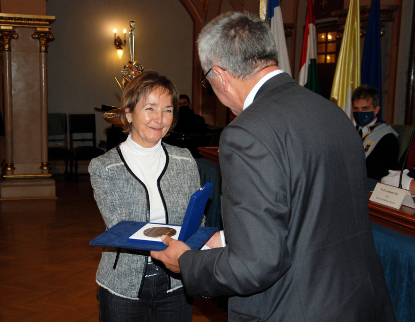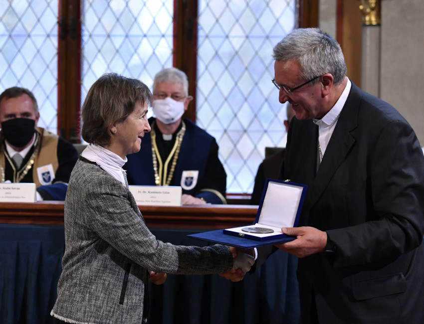 A Pázmány-napi központi rendezvény keretében vehette át Rojkovich Bernadette, a Magyar Bioetikai Társaság elnöke a Pázmány-plakettet Veres Andrástól, az MKPK elnökétől.