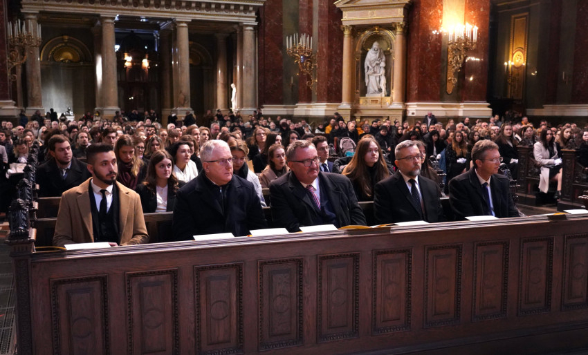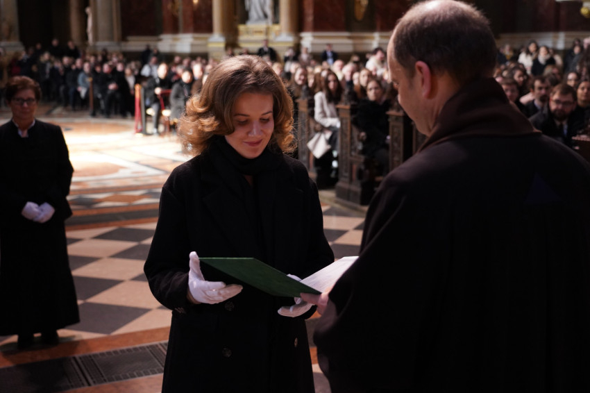 Megtisztelő lehetőség és felemelő élmény volt a Pázmány BTK számára, hogy a keresztféléves diplomaátadó ünnepséget a magyar katolikus élet központjában, a Szent István-bazilikában tarthatta. Szombaton délelőtt a Pázmány Péter Katolikus Egyetem Bölcsészet- és Társadalomtudományi Karának (PPKE BTK) 108 alap- és mesterképzést végzett hallgatója foglalta el az első padsorokat a bazilikában. A hálaadással és a békéért szóló imádsággal egybekötött ünnepségen címzetes egyetemi kinevezéseket is átadott az intézmény vezetése. A diplomaátadón a kétszáz hozzátartozó mellett részt vett Hankó Balázs innovációért és felsőoktatásért felelős államtitkár, Hegyi László egyházi felsőoktatási és szakképzési intézmények fejlesztéséért felelős miniszteri biztos, valamint Schanda Tamás, a köztársasági elnök kabinetfőnöke is.