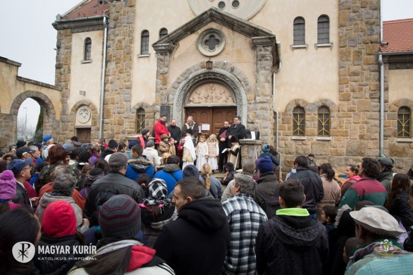 A karácsonyi ételosztás a gyerekek betlehemes műsorával kezdődött. A karitász szervezésében idén összesen kétszáz adag pörköltet főztek.