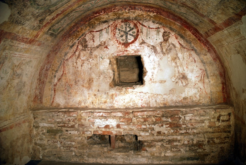 A Képes krónika szerint Péter királyt később „Pécsett temették el abban a székesegyházban, melyet ő alapított Szent Péter apostol tiszteletére, második uralkodása harmadik évében”. Bár a székesegyházat eleinte csak Péter apostolnak dedikálták, és ez évszázadokon keresztül így is maradt, a két apostolfejedelem együttes kultuszának a térségben már igen korai nyomait ismerjük. Az 1782-ben megtalált ókeresztény sírkamra északi falán Péter és Pál apostol a feltámadt Krisztust jelképező, koszorúval és füzérdísszel övezett krisztogramra mutatnak. Pécsett sajátos értelemben is igaz, hogy Péter az első, és Pál az utolsó apostol.