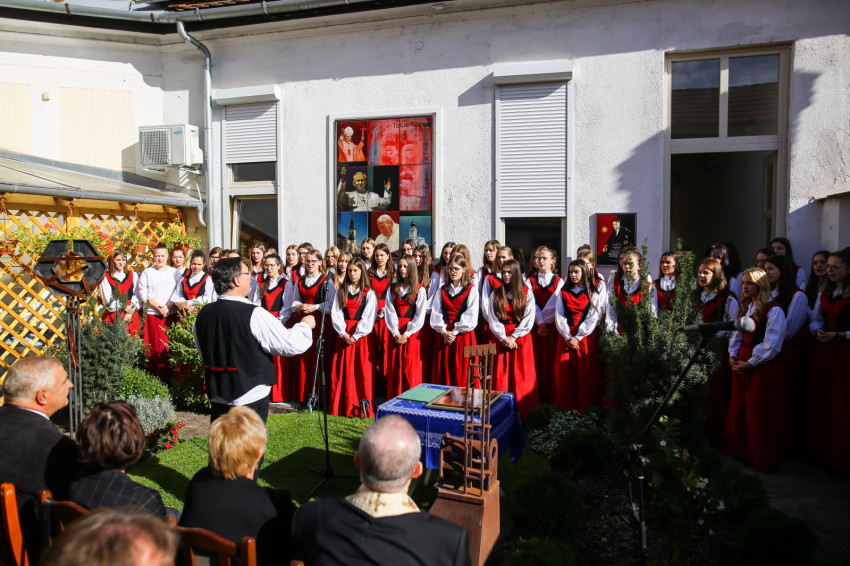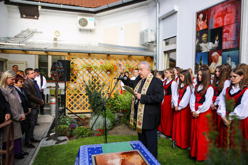 Pintér Gábor érsek, Honduras apostoli nunciusa a ház régi barátjaként van jelen, hogy megáldja a művet. Az érsek arra emlékeztetett, hogy negyvenhárom évvel ezelőtt, éppen ezen a napon iktatták be a szent pápát Péter székébe. „Szent II. János Pál programja megrengette a világot. »Ne féljetek!« buzdításával arra hívta meg a világot, hogy megnyissák az egymástól elzáró ajtókat, határokat. II. János Pál az Isten szeretetére tudta megnyitni az emberek szívét. Közelebb hozta egymáshoz a népeket azáltal, hogy az emberi méltóság, a párbeszéd, a szolidaritás nagykövete volt. Ezt a szellemiséget őrzi ez a ház, amikor elébe siet a rászorulóknak” – fogalmazott Pintér Gábor.