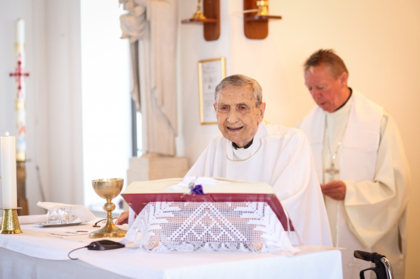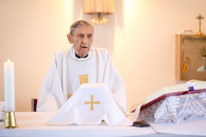Dobozy István hét éve él a pilisvörösvári otthonban. Lelki beszélgetéssel, beteglátogatással, imával, szentmise bemutatásával, gyóntatással segíti az otthonban lakók hitéletét. Kilencvennyolc éve ellenére lendületesen vonult be a szentmisére. Szemüveg nélkül, hangosan, jól intonálva olvasta a szentmise szövegeit. Szentbeszédében röviden áttekintette életútját, és a lakótársak számára vallott lelkipásztori hivatásáról.