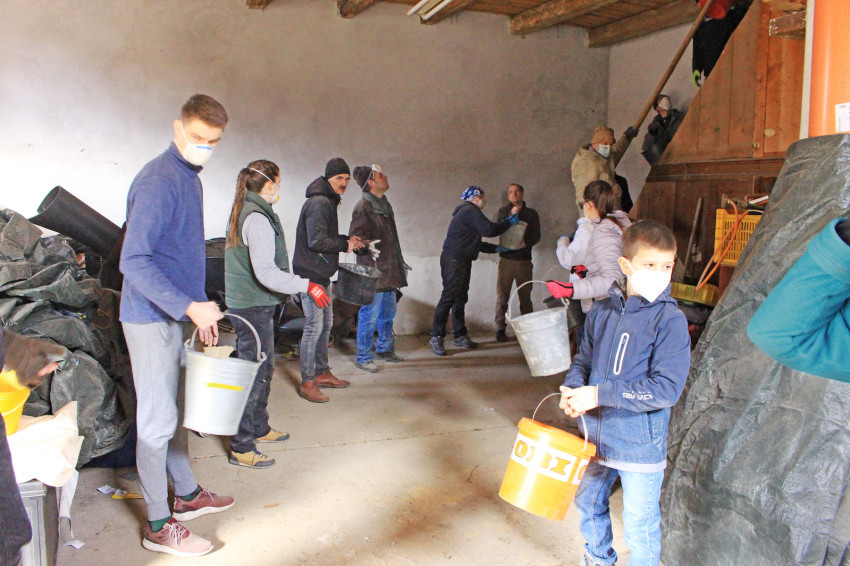 Több mint száz ember gyűlt össze a munkálatokra. A nagy többség a gerendázat agyagtapaszának eltávolításán dolgozik az épület padlásán. Óriási a por, az emberek maszkkal védekeznek ellene. Főként férfiak alkotják a csapatot, de nagyon sok nő is beállt az élő láncba. Agyaggal megrakott vödrök járnak kézről kézre végig a tetőtéren, majd le a lépcsőn, a földszintre. Lenn már várakozik a talicskások sora, hogy elszállítsák az agyagot a plébániakert végében álló konténerekbe.