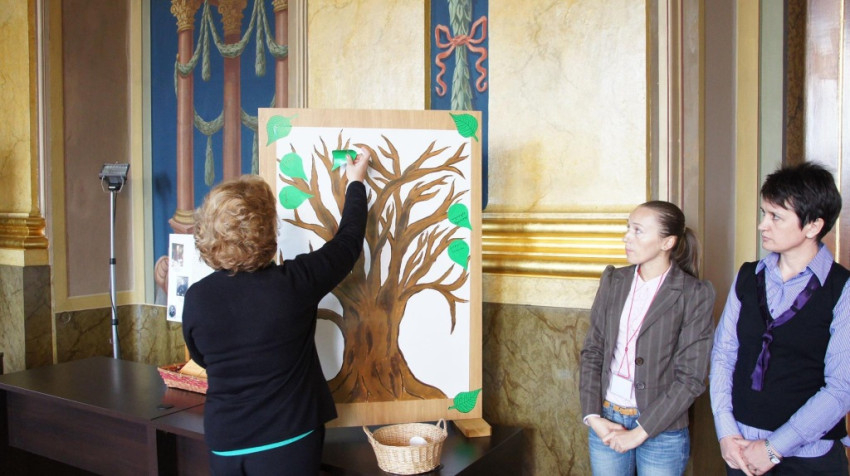 Az egybegyűltek a regisztrációnál egy-egy papírból kivágott falevelet kaptak, melyre a rendezvénnyel kapcsolatos gondolataikat írták fel, s amelyek aztán fel lettek ragasztva egy életfára/családfára. Ennek jelkép értékéről Braun Enikő és Lakatos Attila beszélt a Püspöki Hivatal képviseletében, magyarul és románul. Mint elhangzott: az örök fejlődésre, megújulásra és egyúttal az összetartozásra szerették volna felhívni a figyelmet, hiszen ahogy az életfa ágain található leveleknek, úgy minden családtagnak, illetve plébániai közösségnek is megvannak a maga személyes történetei, ezek mégis egymásba fonódva egységet alkotnak, és összetartó erejéből bontakozik ki az az egész, mely minden alkotóelemének van hivatása és küldetése.