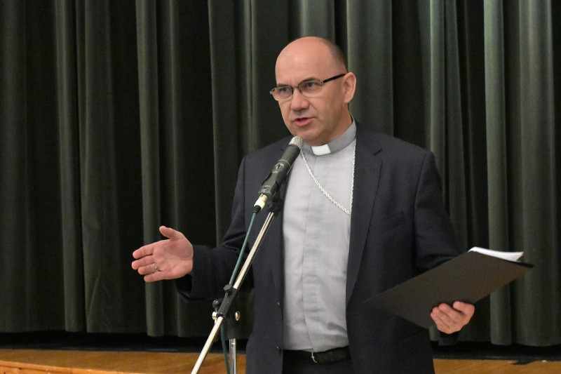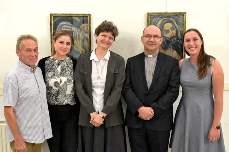 A megyéspüspök köszöntőjében bemutatta a festőművész életét, nagyobb alkotásait (falképek, üvegfestmények), méltatta munkásságát, érdemeit. Gyermekkönyv-illusztrációi kapcsán kiemelte, milyen fontos a tárgyi tudás mellett a szépség elültetése a gyermekekbe. Beszéde végén arra hívta a jelenlévőket a püspök, hogy lássák meg Isten és ember kapcsolatát az alkotásokban, és ezáltal is erősödjenek meg hitükben.
