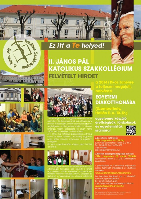 Olyan keresztény fiatalokat hívnak a szakkollégium közösségébe, akik Szombathelyen tanulnak szeptembertől, és szeretnének egy olyan helyen lakni, amely egyszerre szellemi műhely, nyüzsgő, vidám közösség, és olyan hely, ahol a lélekben is rend születik.