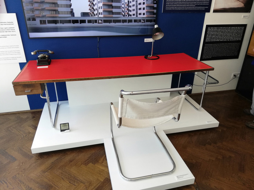 Az emeleten, a dolgozószobában Breuer Marcell egyik eredeti csővázas székét láthatjuk, mellette egy piros munkaasztal, amely szintén a modernizmus szellemében készült. Adolf Loos ezt írta az Ornamens és nevelés című cikkében, 1897-ben: „Nálunk még mindig az a nézet uralkodik, hogy csak arra szabad rábízni egy szék megtervezését, aki kívülről tudja az öt oszloprendet. Én viszont úgy gondolom, hogy elsősorban az üléshez kellene valamit értenie.” A korszakban több bútortervező foglalkozott a tökéletes szék megalkotásával, székanalízissel. Breuer Marcell hajlított csőszékének acélváza mindenütt azonos mértékben veszi fel a test súlyát, a rajta kifeszített szövet pedig követi annak alakját. A Heisler-gyár székeinek háttámlája kényelmesen tartotta a hátat, és az acélrugós felfüggesztésnek köszönhetően jól idomult a testtartáshoz. A gyárnak Kozma Lajos is tervezett székeket.
