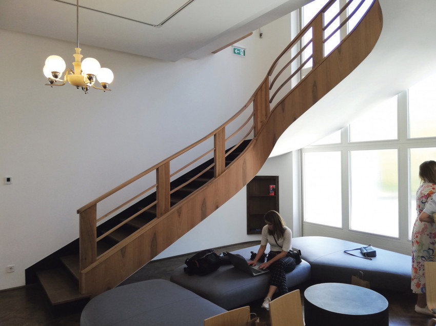 De térjünk vissza a Walter-villába! A földszintre azok a helyiségek kerültek, amelyeket elsősorban nem a vendégeknek szántak. Itt vannak a kiszolgálóterek, a konyha, a kamra és a házmester lakása. A legnagyobb helyiség az emeleti szalon, ahol a tulajdonosok a vendégeket fogadták. A felújításnál az építész, Kokas László nagyon ügyelt arra, hogy ami az épület eredeti darabjaiból megmaradt, azt felújítva megtartsák. Ilyen az emeletre vezető falépcső is, ami meglepő módon épen maradt az idők folyamán. A szépen megcsiszolt nyersfa lépcső hullámzóan kanyarog felfelé. A ház az 1949-es államosítás után a Belügyminisztérium Központi Kórházának része volt, sokáig gyermekorvosi rendelőként, majd óvodaként szolgált. Az épület második emeletére kerültek a privát szféra terei, azaz a hálószoba, a dolgozó, a gyerekszoba, a gardróbok és a fürdőszobák.