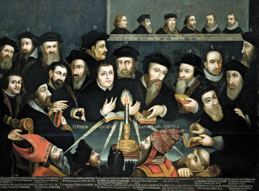 Harmadikként, végül, de nem utolsósorban pillantsunk a kiállítás látogatóitól búcsúzó textilháttérre, amely a kereszténység családfáját ábrázolja, az egyik legnagyobb hívő gondolkodó, az amerikai-angol T. S Eliot szavaival: „Egy fát nem lehet felépíteni, csak elültetni lehet…” Maradéktalanul igaz ez a reformáció ötszáz esztendős fájára is. Amelynek növekedését e nagy gonddal és szeretettel létrehozott látványegyüttes híven, s minden felekezetnek élményt és tanúságokat kínáló módon ábrázolja. Harag és részrehajlás nélkül.