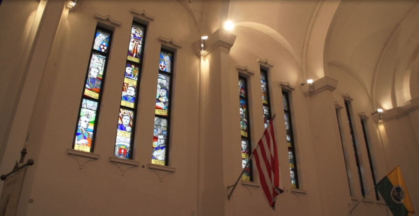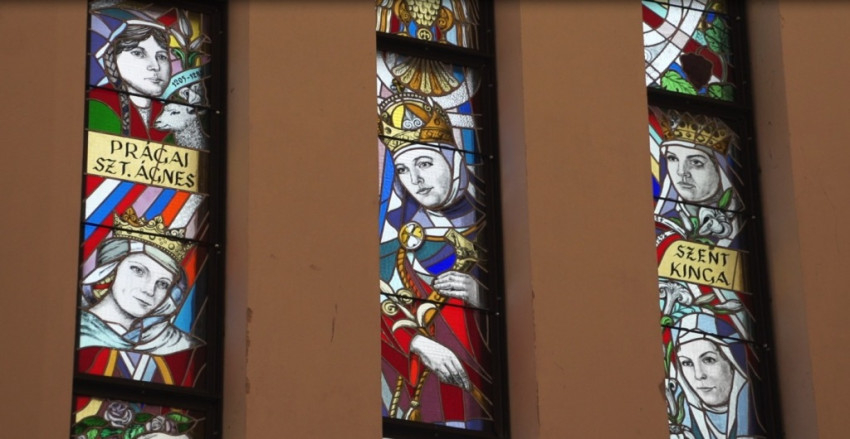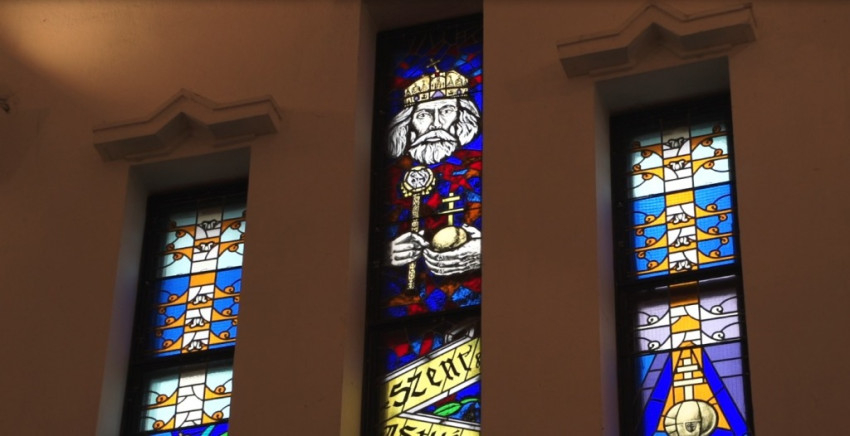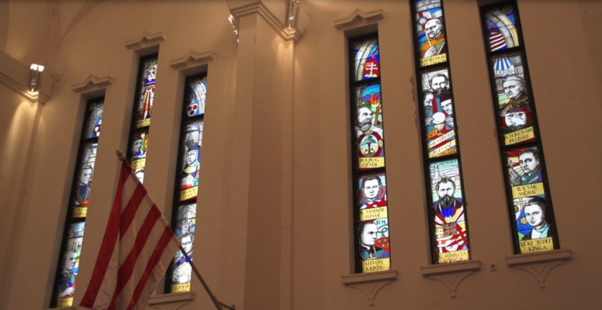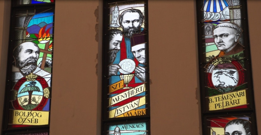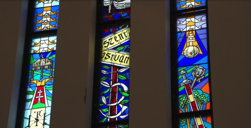 Az ólomüveg ablakokat, melyek Magyarország történelmét meghatározó szenteket, vértanúkat és kiemelkedő személyeket ábrázolnak, Domonkos László készítette.