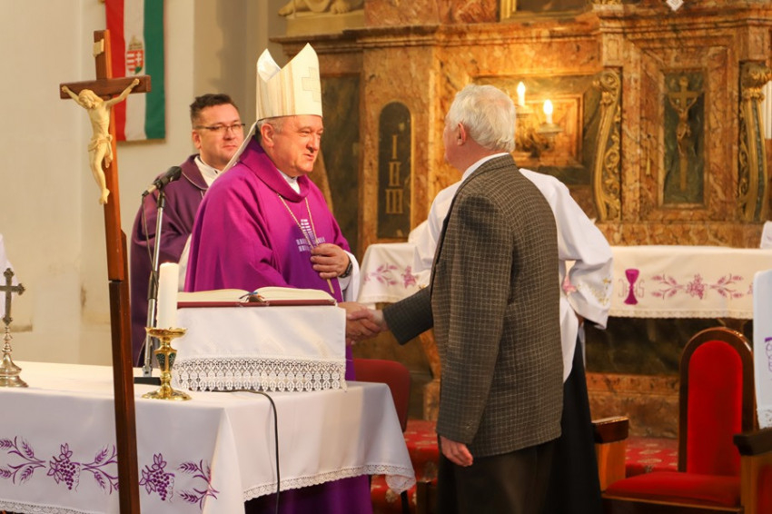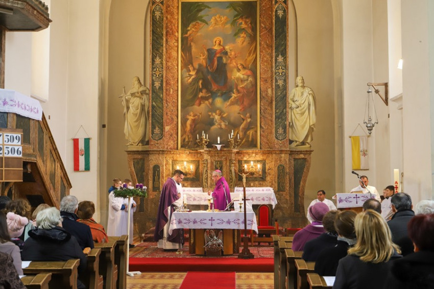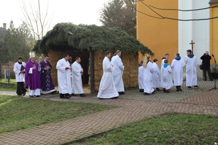 Veres András püspök a szertartást megelőzően megáldotta a templom felújított tornyát, a betlehemet, illetve az új lélekharangot.