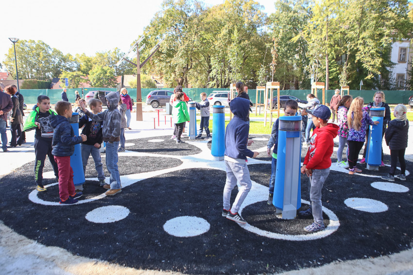 Az áldás után a gyerekek birtokba vehették a parkot és a játszóteret, melyben faragott mesefigurákkal díszített, egyedi tervezésű játékok várják őket.